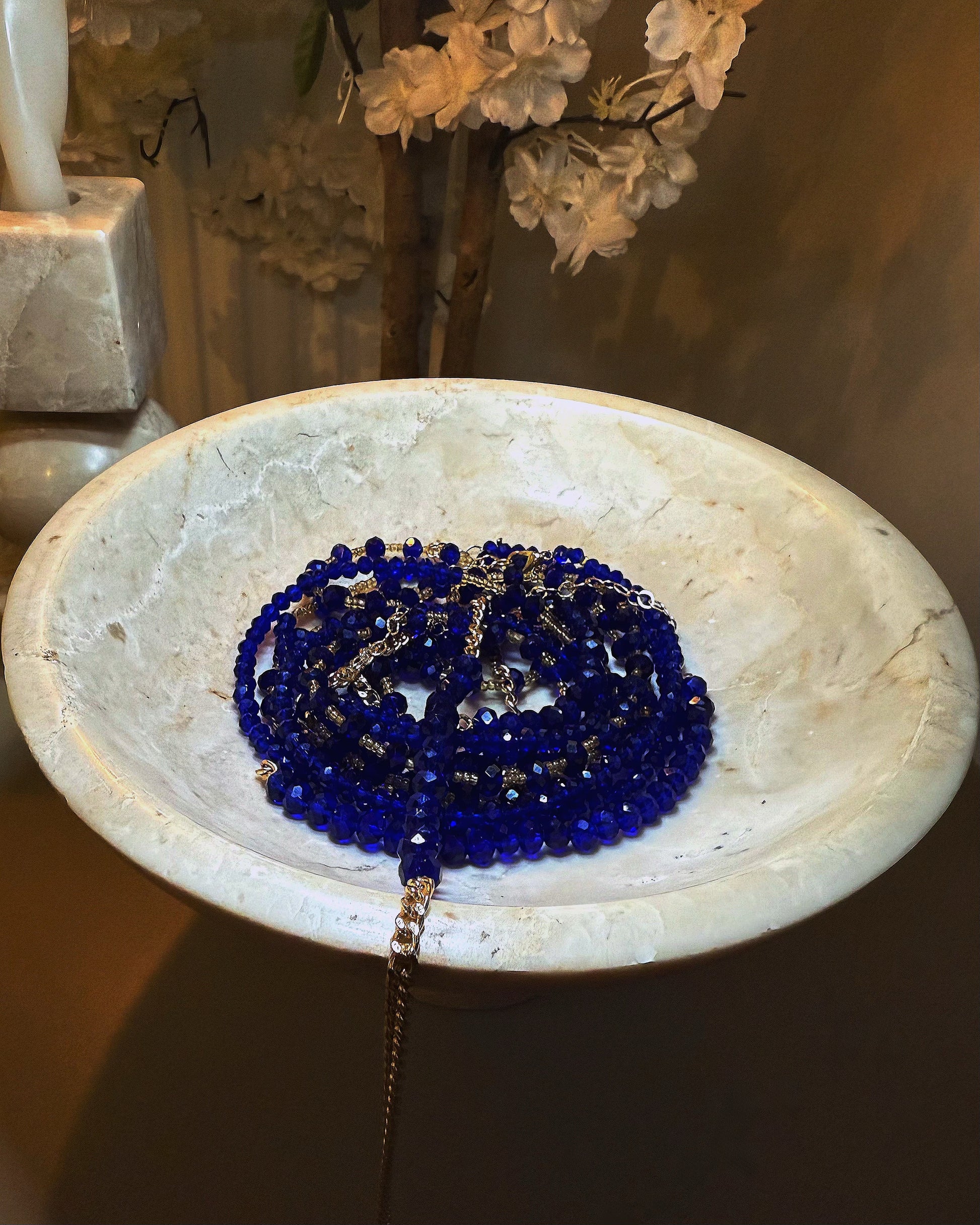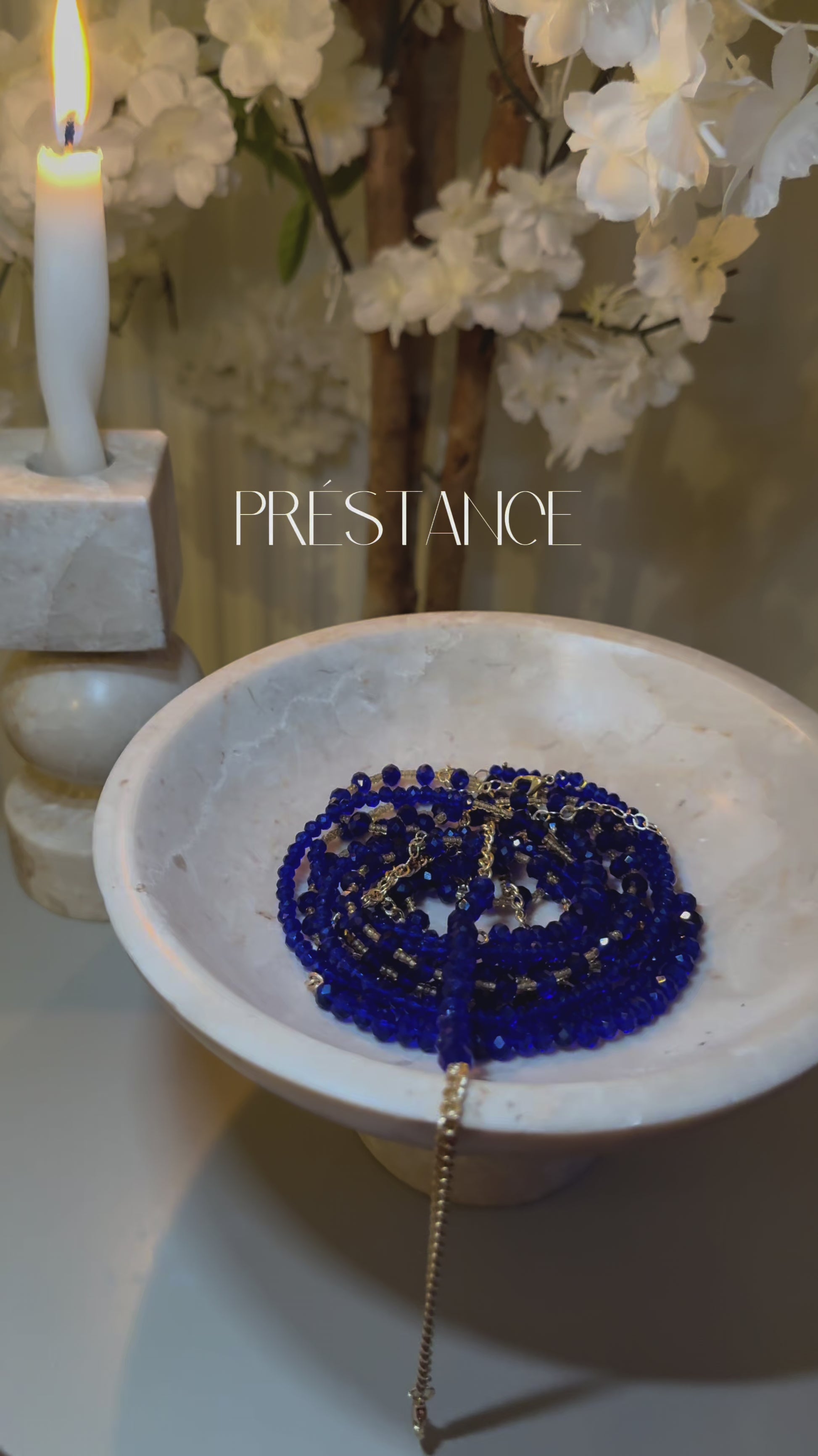 Découvrez PRÉSTANCE : Perles bleues fines, élégamment accompagnées de chaîne dorée. Un bijou qui marie la fraîcheur du bleu à la chaleur du doré, créant une pièce à la fois délicate et raffinée. La légèreté des perles bleues, associée à la fluidité de la chaîne dorée, ajoute une touche d’élégance discrète, qui va sublimer chaque mouvement avec finesse et éclat.