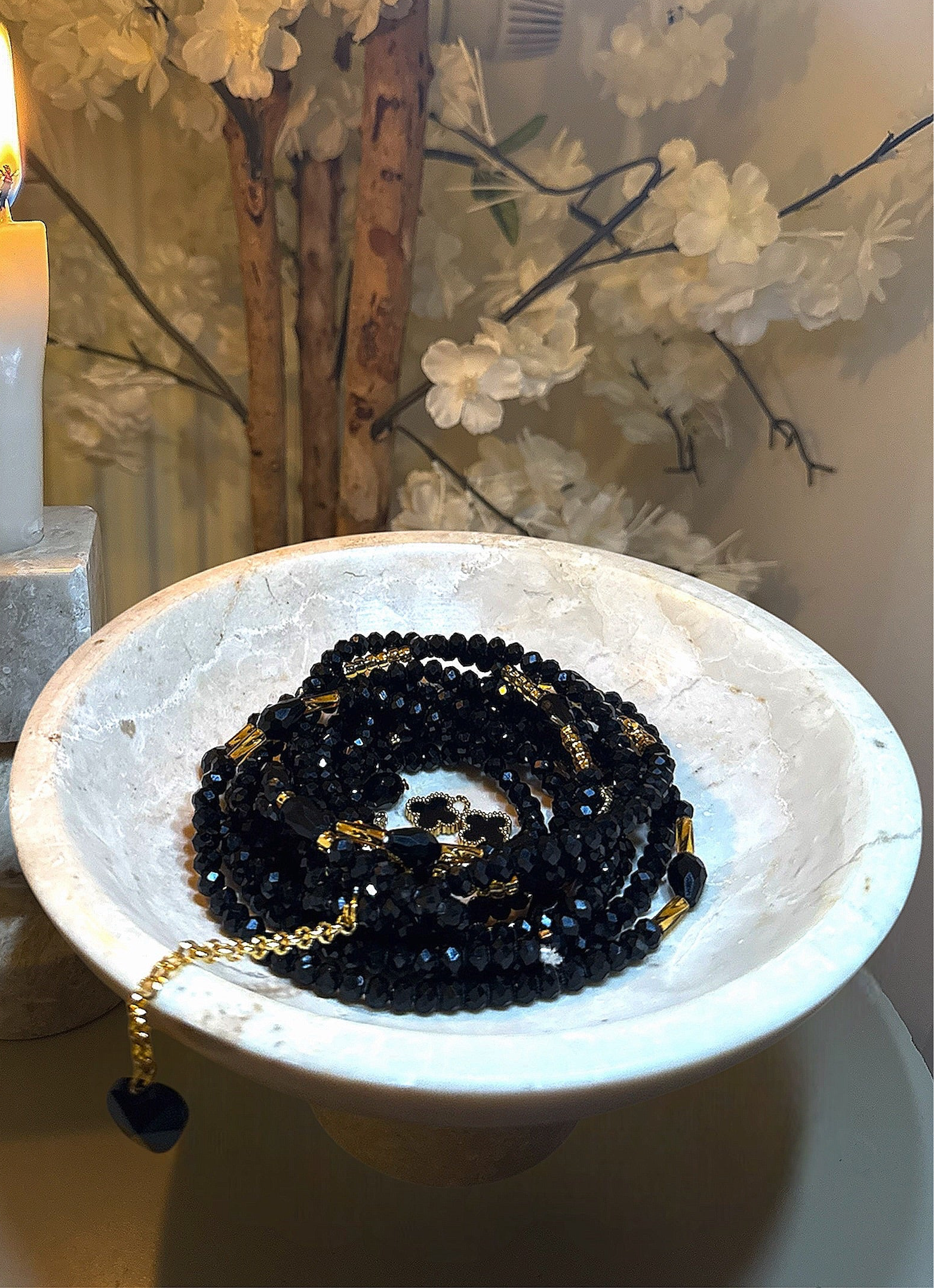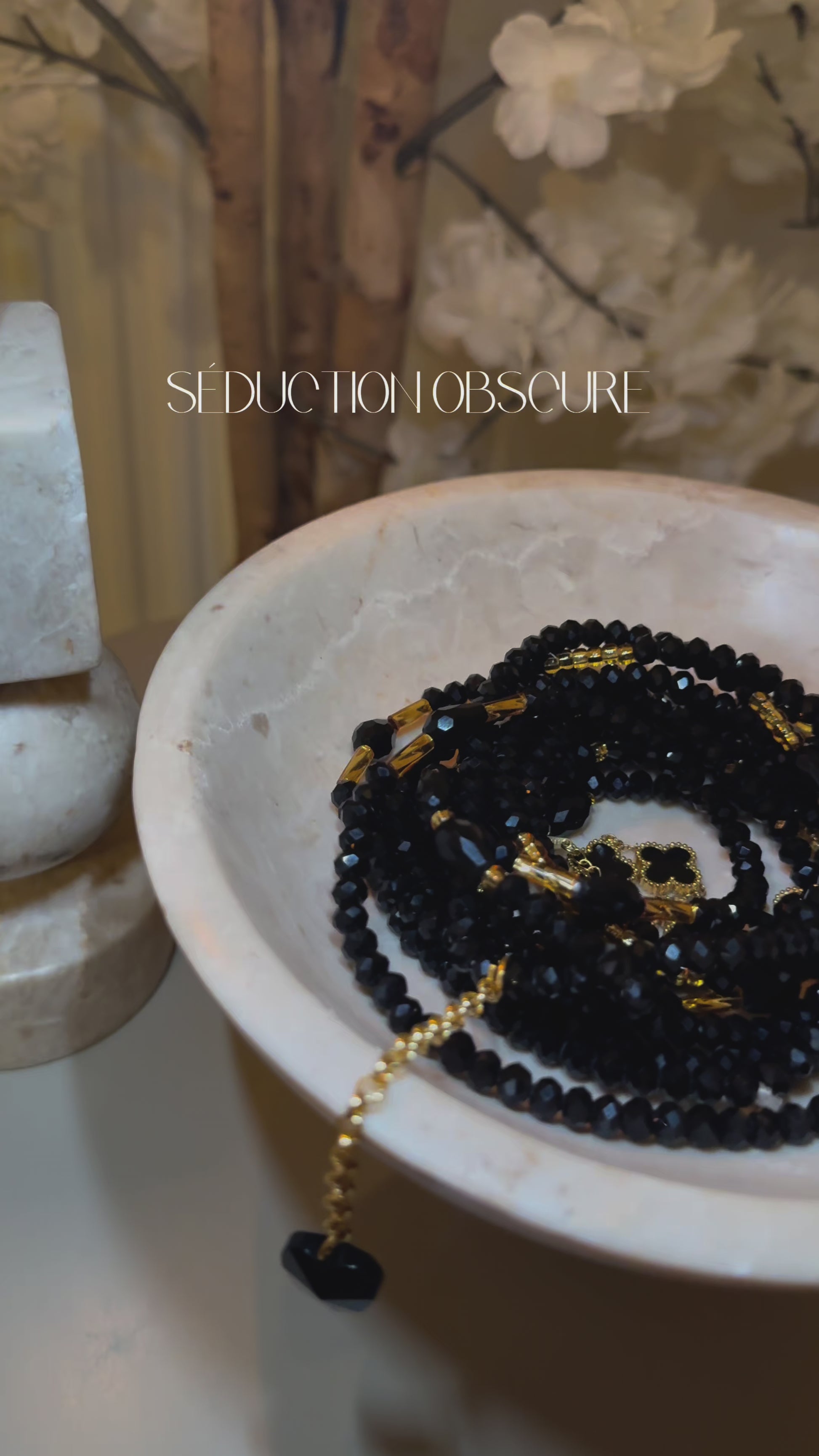 Découvrez SÉDUCTION OBSCURE : Des perles noires de taille moyenne, sublimées par des trèfles noirs et dorés. Un bijou qui associe l’intensité du noir à l’éclat du doré, pour mettre en valeur chaque courbe, de tes hanches à ta taille. Élégance discrète et caractère affirmé, idéal pour accentuer la sensualité de chaque mouvement.