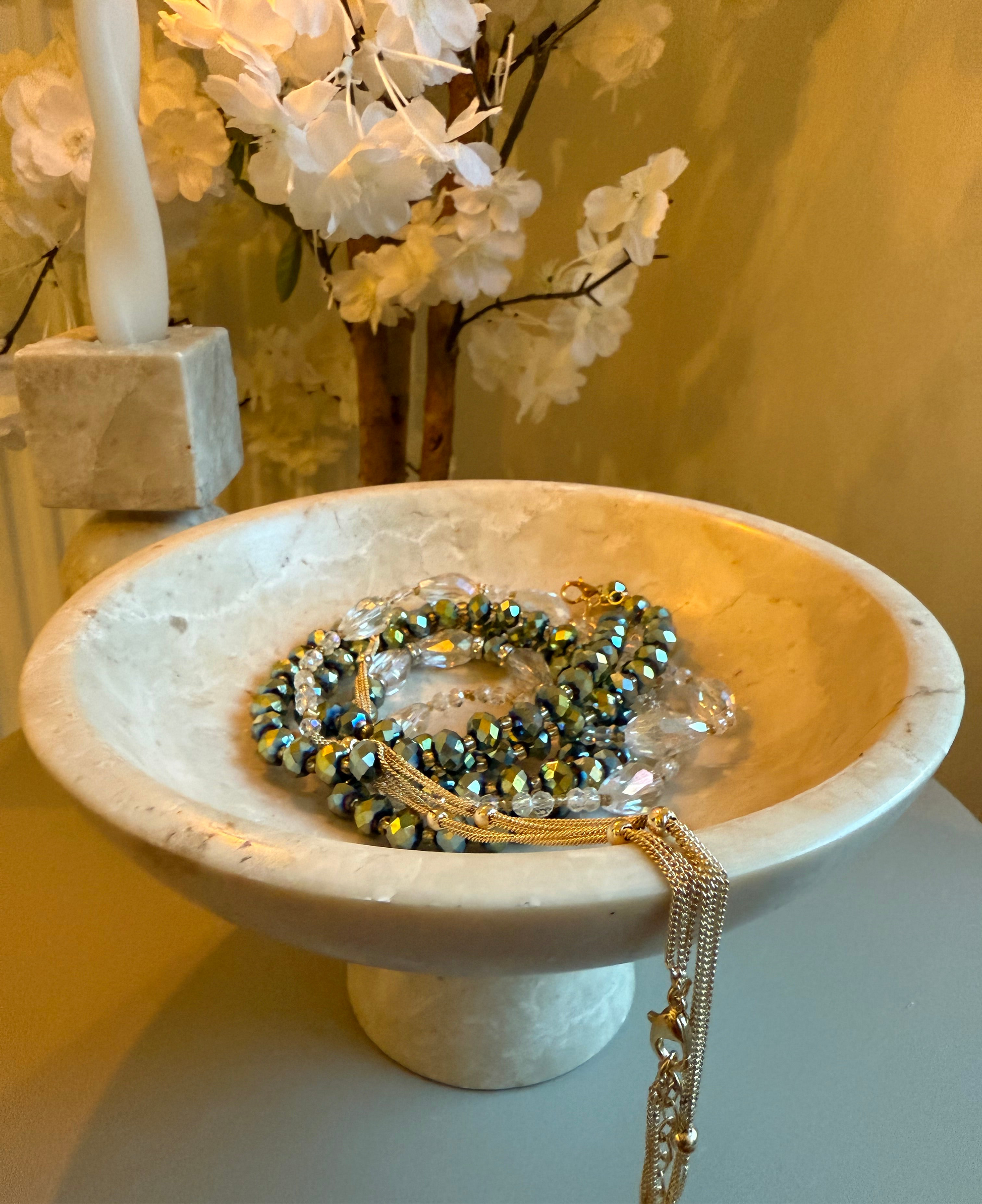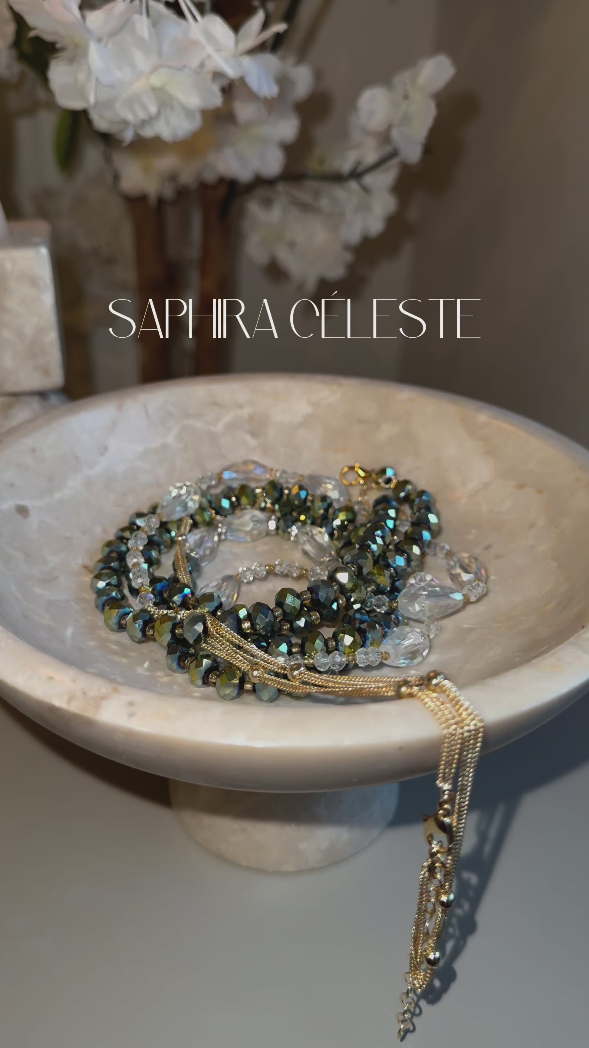 Découvrez SAPHIRA CÉLESTE : Une chaîne de taille ornée de perles en cristal vert et transparent, accompagnée d’une chaîne dorée. La transparence des perles et la vivacité du vert se mêlent harmonieusement à la chaleur du doré, créant un bijou lumineux et raffiné. Une pièce élégante qui met en valeur chaque mouvement avec simplicité et style.