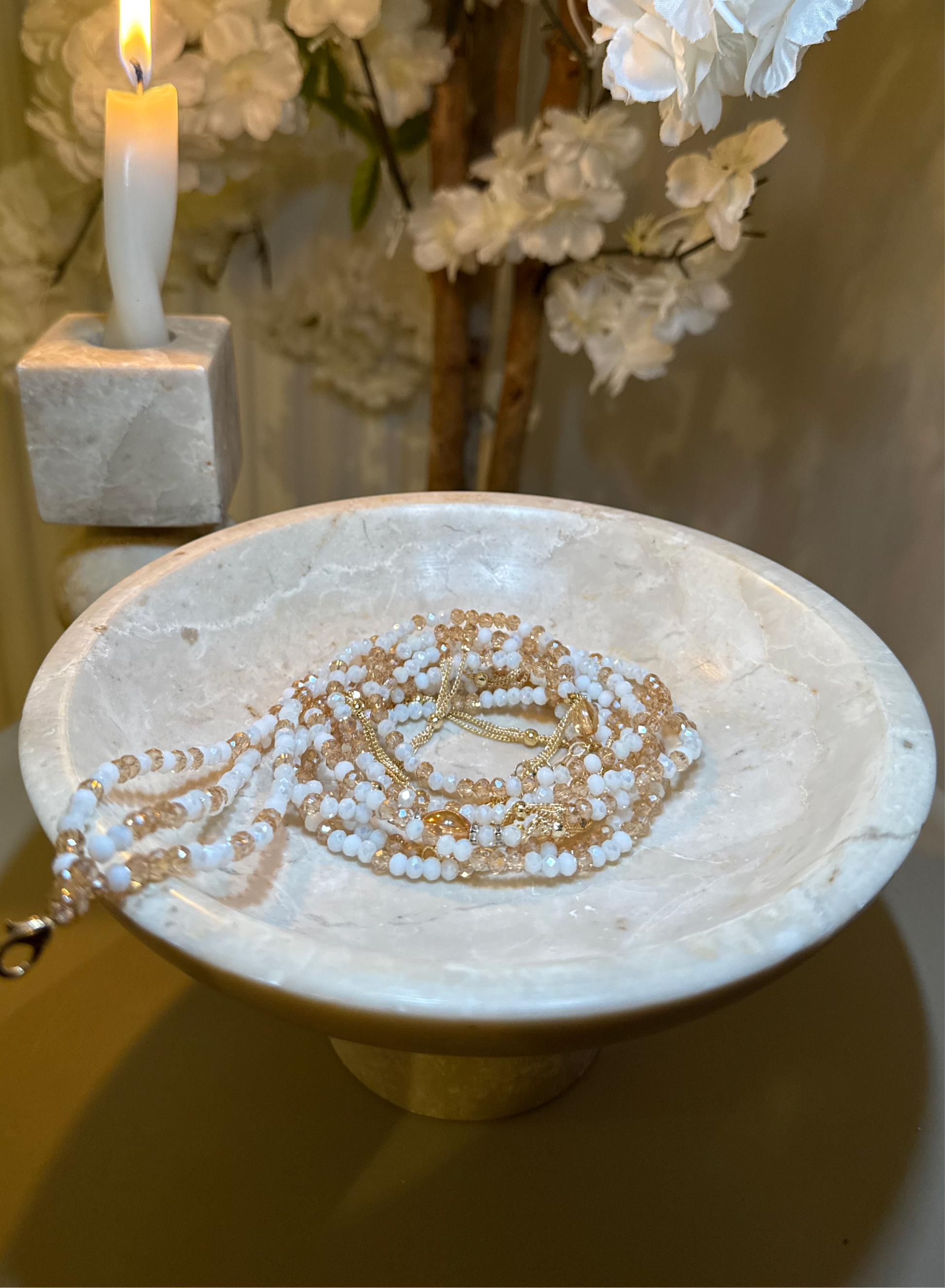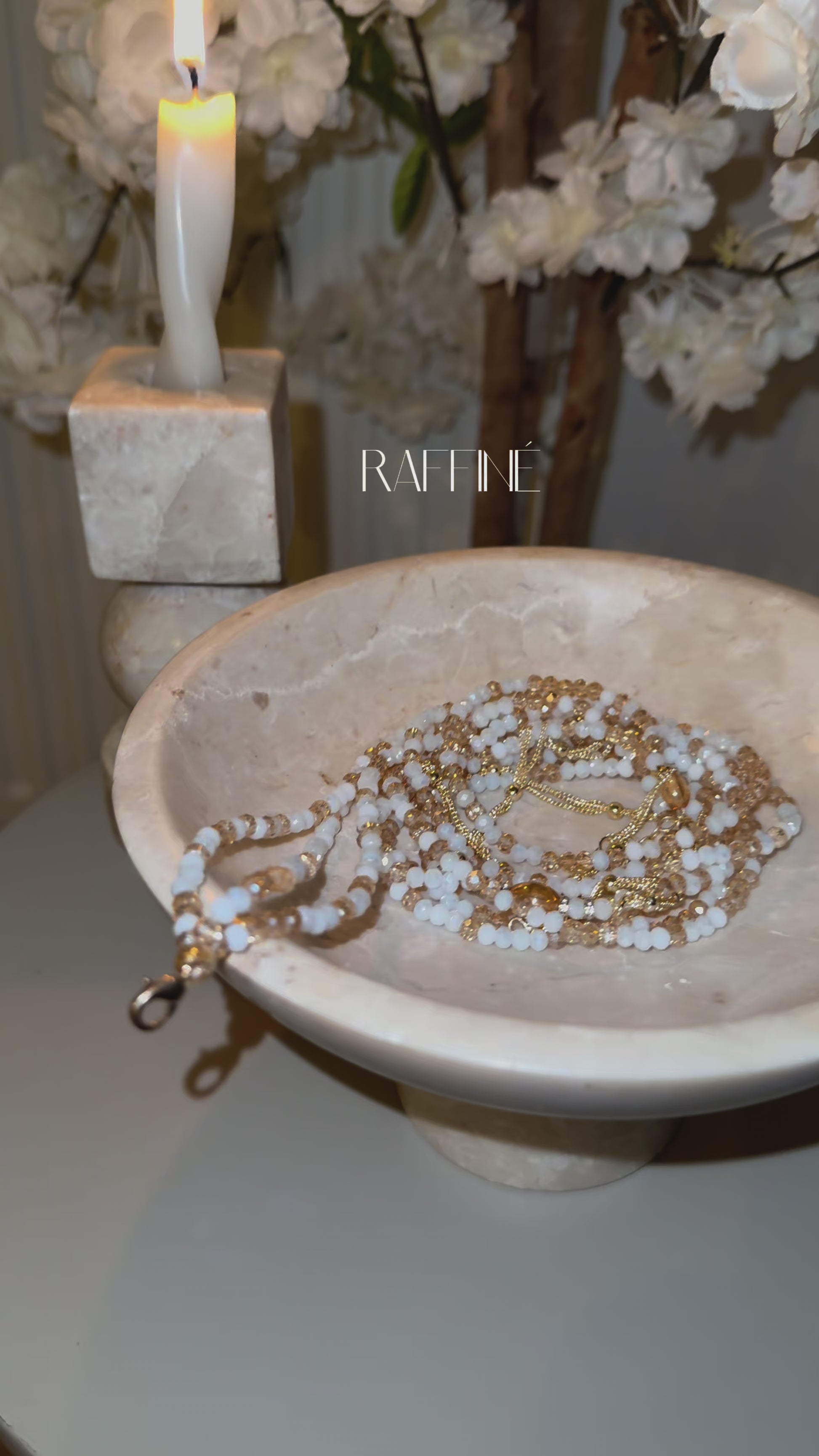 Découvrez RAFFINÉ : Des perles nude et blanches, se fondent avec une chaîne dorée fine. Un bijou raffiné qui incarne la simplicité et la sophistication, apportant une touche de lumière et d’élégance à chaque mouvement. Une pièce discrète mais pleine de charme, parfaite pour sublimer la féminité dans toute sa douceur.